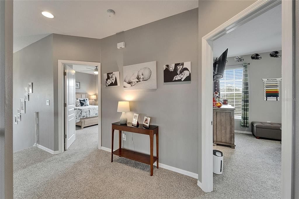 This hallway acts as a cozy transitional space connecting two bedrooms, distinguished by soft beige carpeting and walls painted in a calm, muted gray. A simple wooden console table with a dark finish anchors the area, adorned with a softly glowing lamp and framed photographs that give a warm, personal feel. Above the table, three grayscale family portraits add an intimate, emotional touch. Doorways on both sides offer glimpses into bedrooms—one with a rustic wooden bedframe and neutral linens, the other featuring a mounted TV and sports-themed décor. Subtle recessed lighting and white trim enhance the crisp, inviting atmosphere.