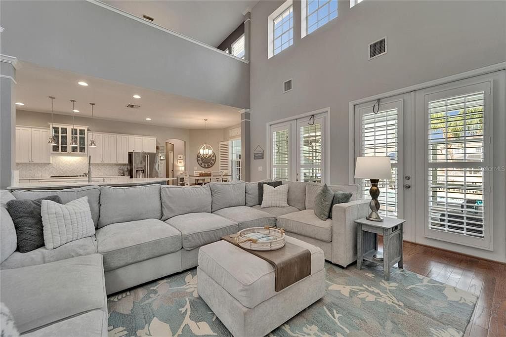This spacious living room features a soft, neutral color palette dominated by light grays and whites, creating a calm and inviting atmosphere. A large, L-shaped sectional sofa anchors the space, adorned with a mix of textured throw pillows that add subtle contrast and comfort. The plush area rug beneath the seating area incorporates muted blue and beige tones with a floral pattern, complementing the hardwood floors. Floor-to-ceiling windows with white plantation shutters bring in abundant natural light, enhancing the bright, airy feeling. The open layout flows seamlessly into a modern kitchen with white cabinetry, stainless steel appliances, and elegant pendant lighting, emphasizing a cohesive and functional living space.