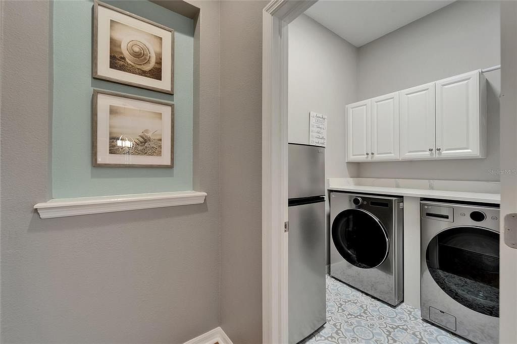 This laundry room features a clean and modern design with a light gray color palette complemented by white cabinetry that offers ample storage space above the washer and dryer units. The room includes sleek stainless steel front-loading laundry machines positioned under a white countertop, providing a practical folding area. The floor is adorned with patterned tiles in muted blues and grays, adding subtle texture and interest to the space. The adjacent wall outside the room is painted in a soft blue-gray tone, decorated with two framed beach-themed photographs, enhancing a calm and coastal-inspired aesthetic.