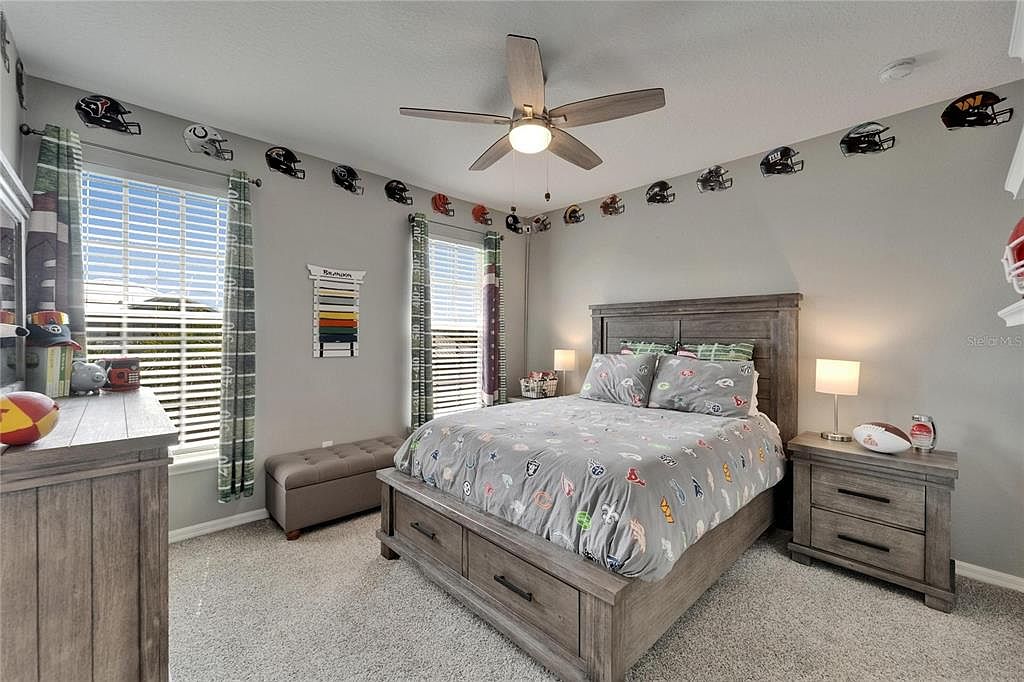 This cozy bedroom features a soft gray color palette complemented by medium-toned wood furniture, including a paneled bed frame with under-bed storage drawers, matching nightstands, and a dresser. Natural light streams in through two adjacent windows dressed in plaid curtains that add a touch of warmth. The ceiling fan with wood-toned blades provides both style and function. A unique sports theme runs throughout the room, highlighted by a series of miniature football helmets mounted along the upper wall perimeter. The bedding also showcases various team logos, reinforcing the sporty and personalized atmosphere. A cushioned bench beneath the windows adds seating and storage convenience.