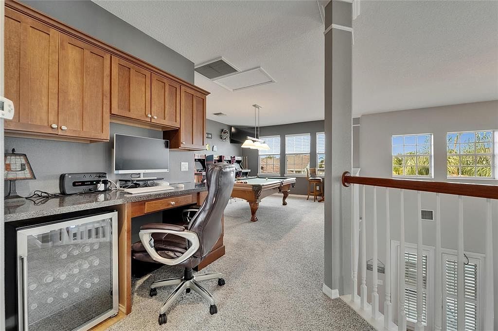 This inviting loft area combines a functional workspace with a recreational zone, creating a versatile upper-level retreat. A built-in wooden desk with warm-toned cabinetry provides ample storage and a granite countertop, hosting a sleek computer setup and a small beverage cooler underneath. Soft neutral carpeting adds comfort underfoot, extending throughout the space. The walls are painted a soothing gray, complemented by abundant natural light streaming through large, grid-style windows. A classic wooden pool table anchors the room, positioned near a cozy seating nook by the windows. White railings with wood accents overlook the lower floor, enhancing openness and flow.