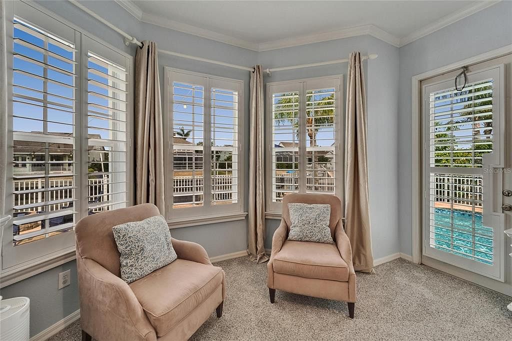 This sunroom features a serene, inviting corner with two plush beige armchairs positioned on a soft taupe carpet. Each chair is adorned with a muted blue-gray patterned pillow that adds a subtle pop of complementary color. The walls are painted in a soft, light gray which amplifies natural light streaming through multiple white-framed, shuttered windows that wrap around the corner, offering stunning poolside views. Floor-length beige curtains frame the windows, enhancing the cozy ambiance while adding a touch of elegance. A door with matching shutters opens directly to the outdoor pool area, blending indoor comfort with outdoor leisure seamlessly.