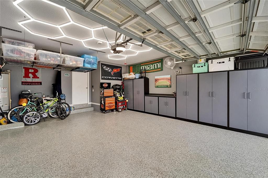 This garage blends functionality with clean organization, featuring a polished speckled epoxy floor that enhances brightness and durability. A series of sleek, gray storage cabinets with black bases line the right wall, providing ample concealed storage space. Above, sturdy overhead shelves hold clear and colored plastic bins for additional organization. The ceiling’s unique geometric LED lighting fixtures add a modern touch while illuminating the entire space evenly. On the left, bicycles are neatly parked against the wall, near banners and memorabilia showcasing team pride and automotive enthusiasm, giving the garage a personalized character.
