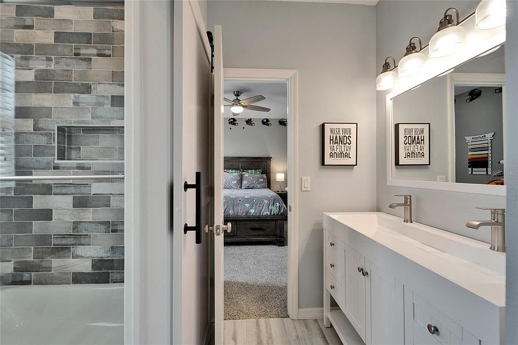 This bathroom features a modern dual-sink vanity with a smooth white countertop and sleek brushed nickel faucets. Its cabinetry is a clean, classic white with simple hardware, complementing the light gray wall color. Above the vanity, a large mirror is flanked by a row of four frosted glass light fixtures, providing ample lighting. To the left, a glass-enclosed shower showcases an array of rectangular tiles in varied gray tones, adding texture and depth. The open door offers a view into a cozy bedroom with a carpeted floor, a wooden bedframe, and a ceiling fan, creating a seamless flow between the two spaces.