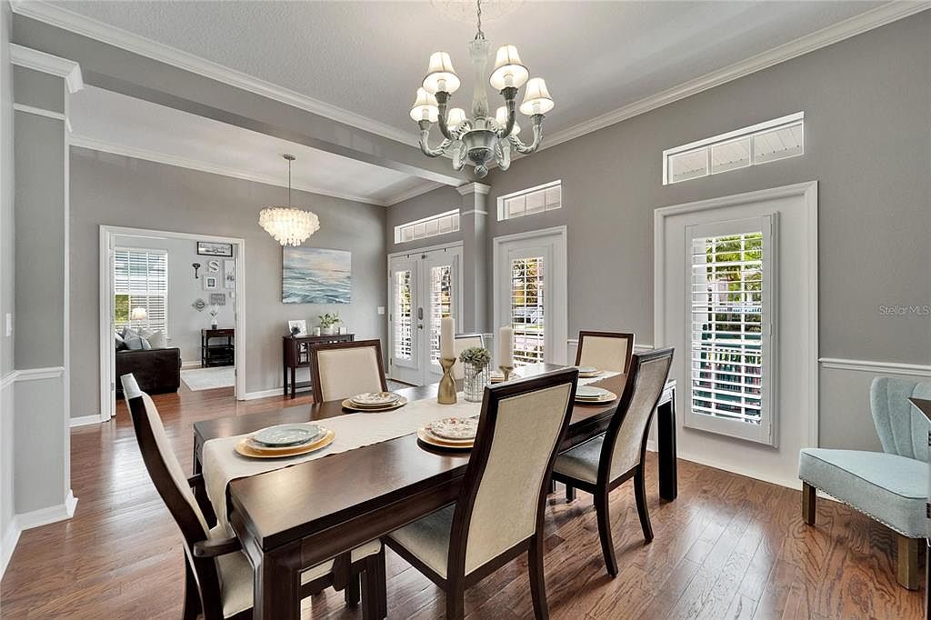 This elegant dining area features a rectangular dark wood table with six matching chairs, each with light beige cushioned seats and backs. The walls are painted a soft, neutral gray complementing the white trim and crown molding, adding a refined architectural detail. Large windows and glass doors with white plantation shutters allow natural light to fill the space, enhancing the warm tone of the hardwood flooring. A classic chandelier with six lampshades hangs over the table, while a smaller chandelier in the adjacent space adds layered lighting. Subtle décor elements like a table runner, plates, candles, and an ocean-themed painting add warmth and character to the room.