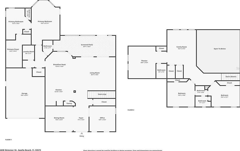 This detailed floor plan reveals a spacious two-level home with a smart, open layout. The first floor features a large living room connected to the kitchen and breakfast nook, forming a hub for family activities. The primary bedroom suite includes a generously sized bathroom, closet, and laundry access. Complementing the downstairs are formal areas like the dining room and office near the entry for added functionality. Upstairs, the family room centers access to two bedrooms with individual bathrooms, a theater room for entertainment, and multiple closets ensuring ample storage. The design combines comfort with practicality, highlighting clear zoning for social, private, and work spaces.