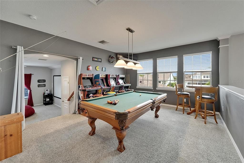 This entertainment area features a classic wooden pool table with claw feet centered on plush, light beige carpeting. A trio of pendant lights with frosted glass shades hangs above, highlighting the billiards setup. Along the darker gray accent wall, a collection of vintage arcade machines adds nostalgic charm and colorful vibrancy. Natural light floods the space through three large windows dressed with white blinds, overlooking the neighborhood. To the right, a wooden high-top table paired with two cushioned stools creates a casual spot for socializing. The adjacent open doorway leads to a cozy media nook furnished with a large screen and bean bags, perfect for movies or gaming, framed by white curtains that add a soft touch against the neutral tones.