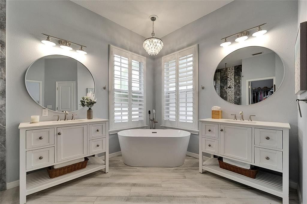 This master bathroom features a symmetrical layout with a central freestanding bathtub placed between two large windows outfitted with white plantation shutters, allowing controlled natural light. Flanking the tub are two identical white vanities with ample storage drawers and open bottom shelves, each topped with round, frameless mirrors and lit by modern light fixtures. The soft gray walls complement the light wood-look tiles on the floor, creating a calm and airy atmosphere. A crystal chandelier adds elegance and a touch of luxury, making this bathroom both functional and visually soothing.