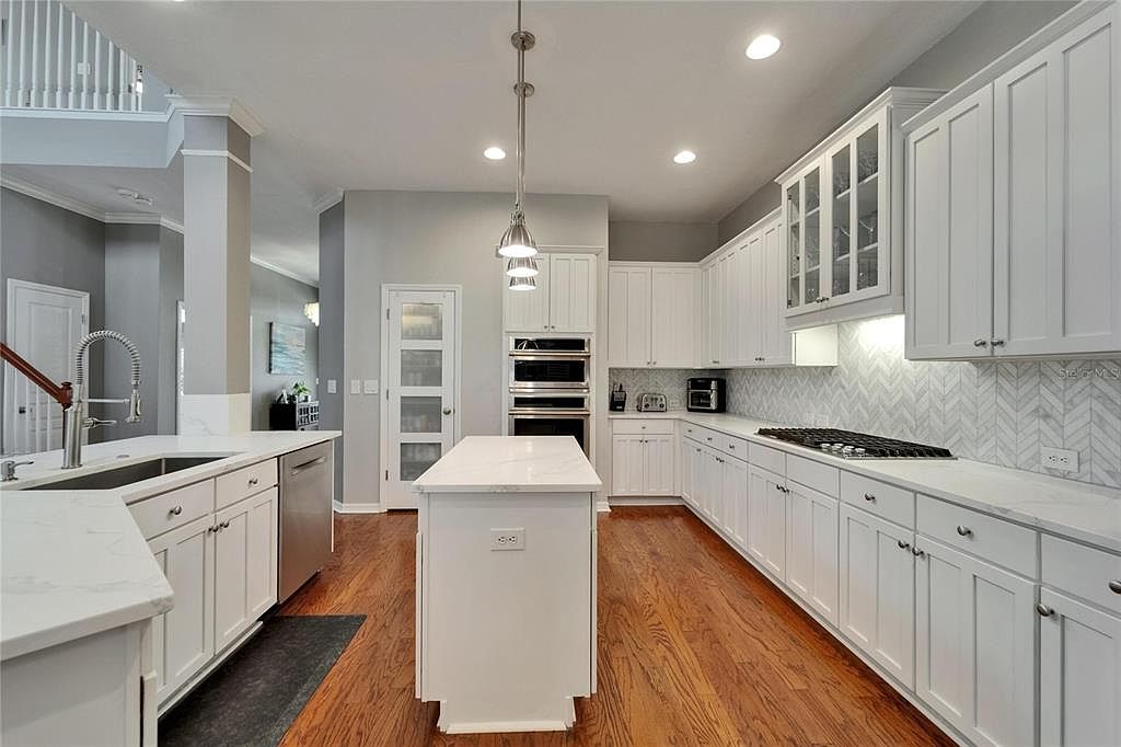 This spacious kitchen features a clean, contemporary design with crisp white cabinetry lining the walls and extending to the ceiling for ample storage. A central island with a smooth white countertop echoes the cabinetry’s color, offering additional prep space and power outlets for convenience. Stainless steel appliances include a built-in oven and a sleek cooktop set against a textured, herringbone-patterned backsplash in subtle shades of white and gray, matching the overall cool tone of the room. Warm wood flooring complements the neutral gray walls, while pendant lights above the island and recessed ceiling lighting provide a bright, welcoming ambiance.