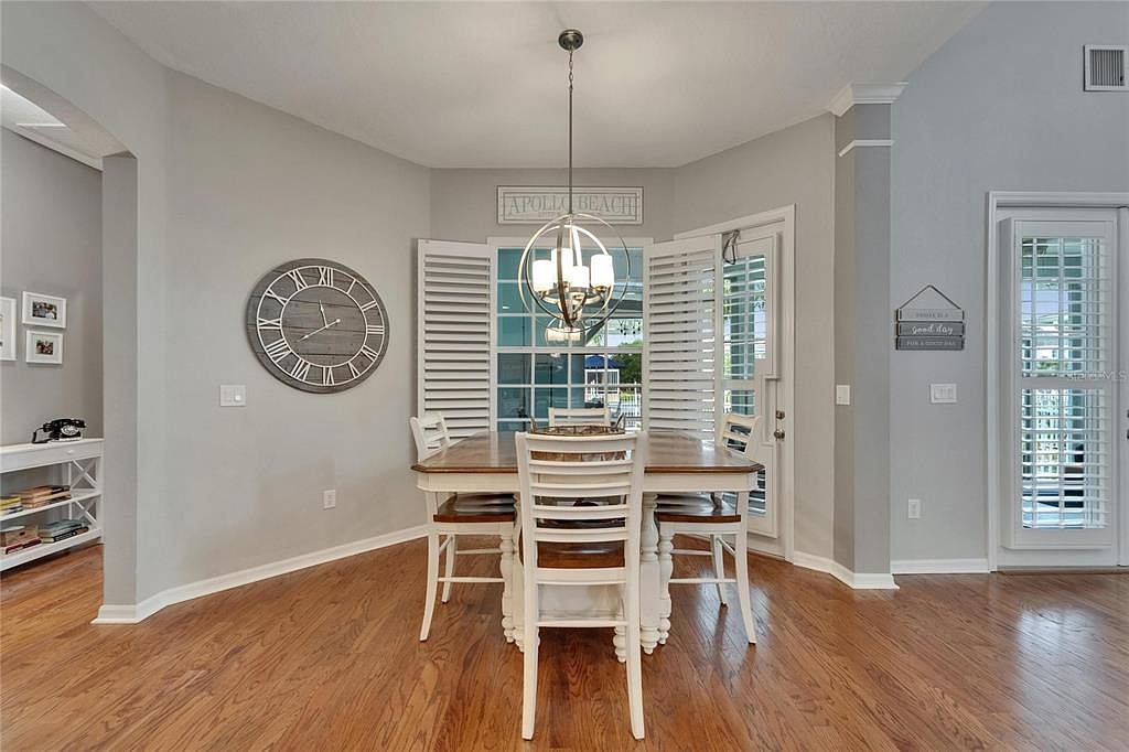 This dining area boasts a cozy, coastal-inspired ambiance with a warm wood floor complementing the muted gray walls. A square wooden table, painted white with a natural wood tabletop, is centered beneath a modern spherical chandelier with soft lighting. White wooden chairs with matching wood seats provide seating for four. Behind the dining set are large windows fitted with white plantation shutters, allowing ample natural light and views outside. Decorative accents include a large round wall clock with Roman numerals, a rectangular “Apollo Beach” sign, and a small wall plaque near a door, enhancing the homey and inviting atmosphere.