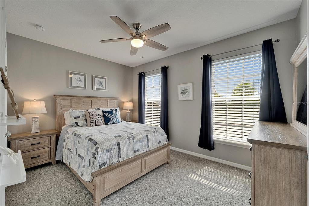 This inviting bedroom features a warm, neutral color palette with soft grey walls and beige carpeting that enhances the cozy atmosphere. A wooden bed frame with a natural finish pairs seamlessly with matching nightstands on either side, both topped with classic lamps radiating soft light. The bed is dressed with linens in subtle, complementary shades and a nautical-themed throw pillow for a touch of character. Two large windows framed with dark curtains allow ample natural light to flood the room, balancing brightness and privacy. A ceiling fan with light completes this restful, well-appointed space.