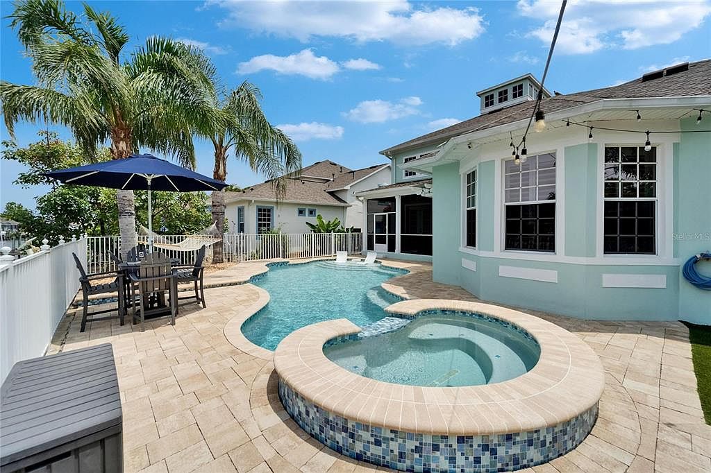This outdoor haven features a tranquil pool area seamlessly integrated with a spa, showcasing soft beige stone tiles that extend throughout the patio. The pool’s curvilinear shape complements the round spa, bordered with a mosaic tile accent in shades of blue, enhancing the aquatic theme. The metal fence encloses the space, offering safety without obstructing views of lush palm trees and clear skies. A shaded dining area with a navy blue umbrella and black chairs invites relaxation and social gatherings. String lights hang overhead, adding a cozy evening ambiance to this inviting backyard retreat.