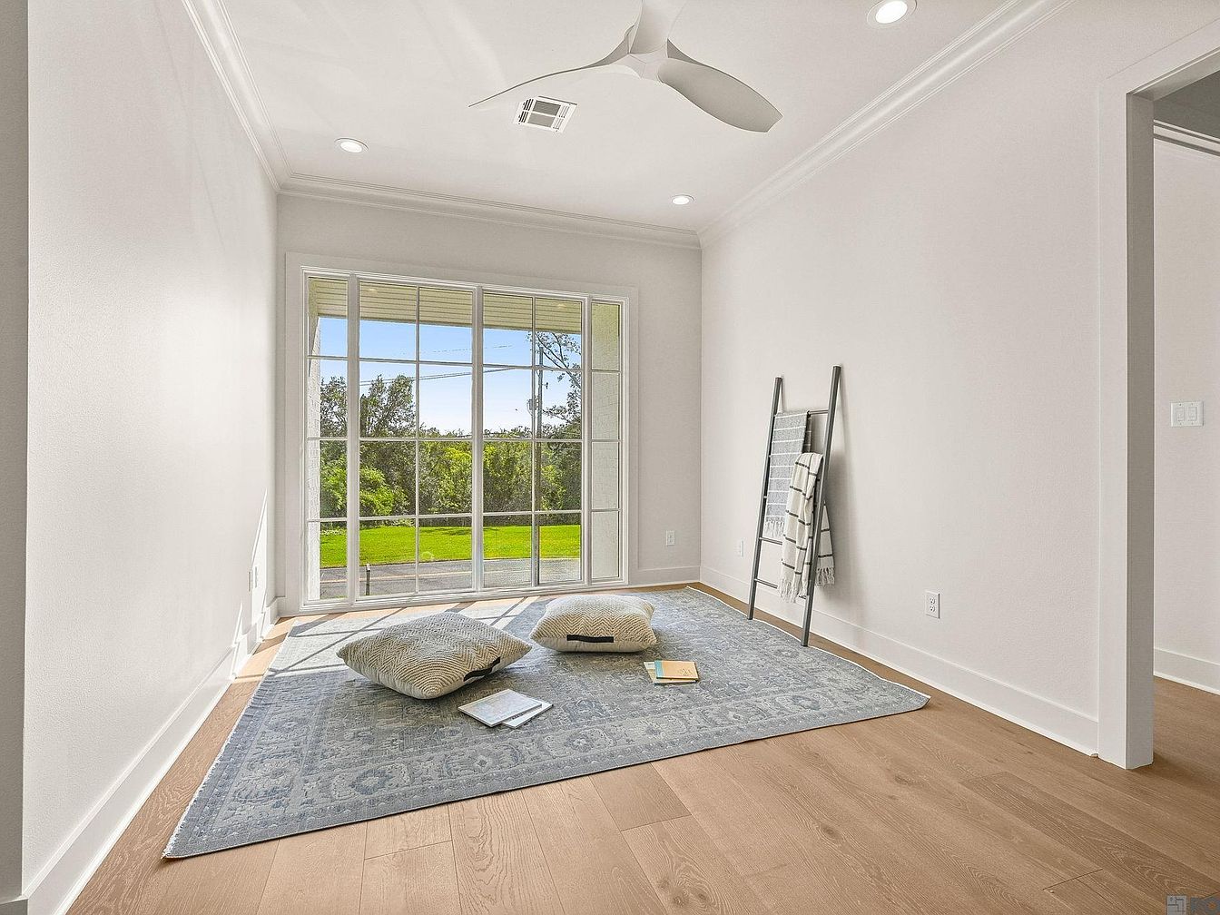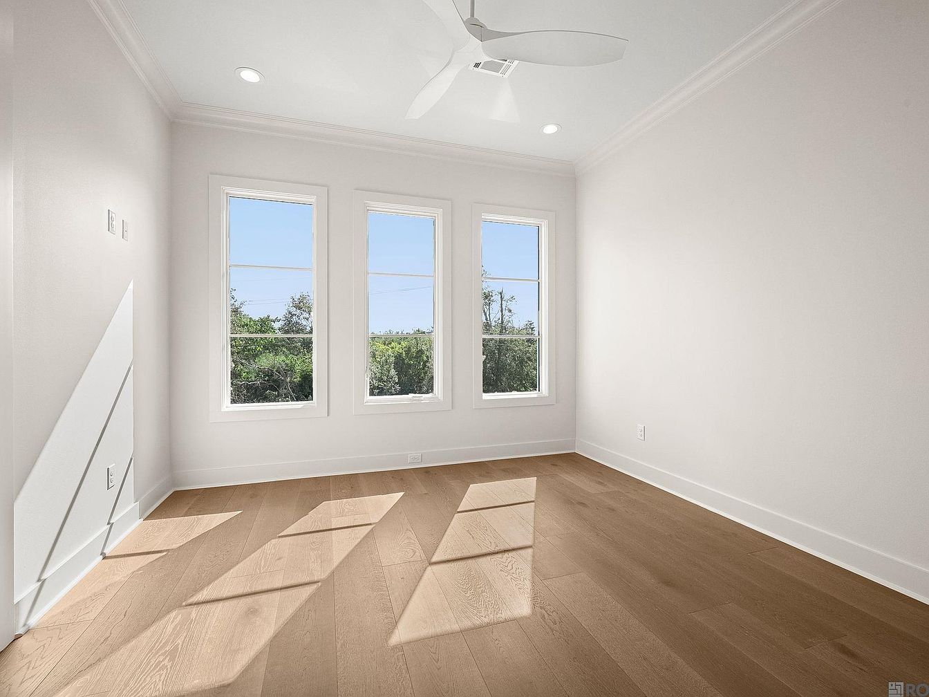 This bedroom features a clean, minimalist design with bright white walls that amplify natural light pouring in through three tall, narrow windows lined up along one wall. The space is accentuated by light-colored wood flooring that adds warmth and texture to the room. Crown molding around the ceiling and baseboard detailing provide subtle architectural interest, while a modern, white ceiling fan offers both style and functionality. The room feels airy and spacious, perfect for personalization, with a soothing neutral palette inviting calming vibes and ample daylight creating a serene atmosphere.