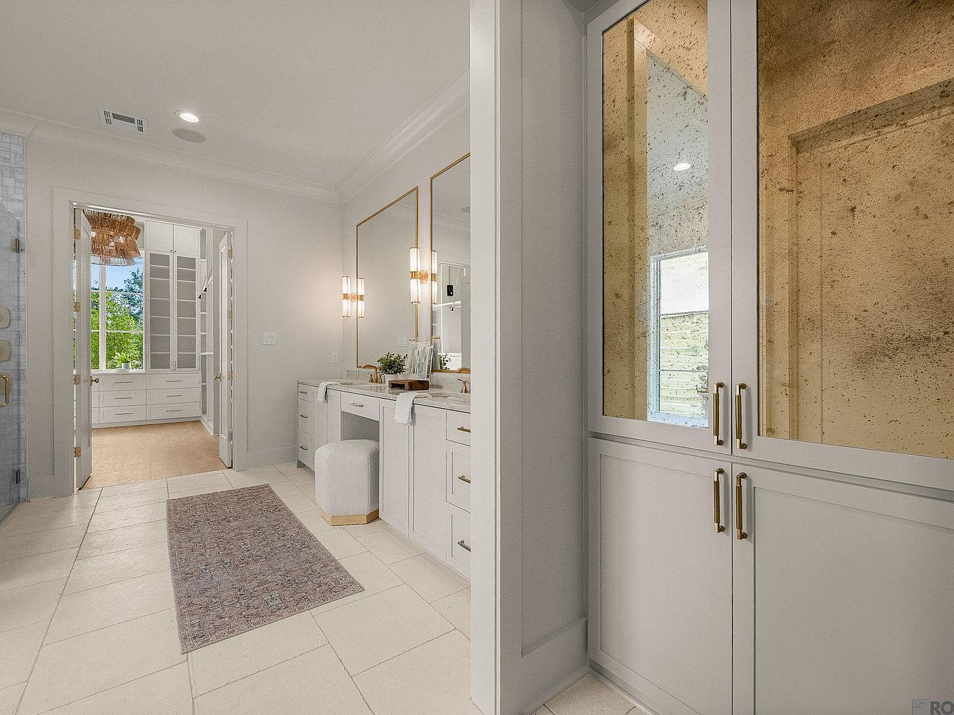 This bathroom exudes a clean, elegant atmosphere with its soft white and light gray tones. The spacious vanity features a dual sink setup with marble countertops, sleek cabinetry, and brass hardware that adds a warm touch. Two large, vertical mirrors are framed in gold, flanked by modern sconces providing balanced lighting. A plush, white upholstered vanity stool complements the design. The floor is tiled in large, neutral tiles that enhance the brightness of the room. Through open double doors, a walk-in closet with organized shelving and bright natural light is visible, offering a seamless flow from grooming to wardrobe.