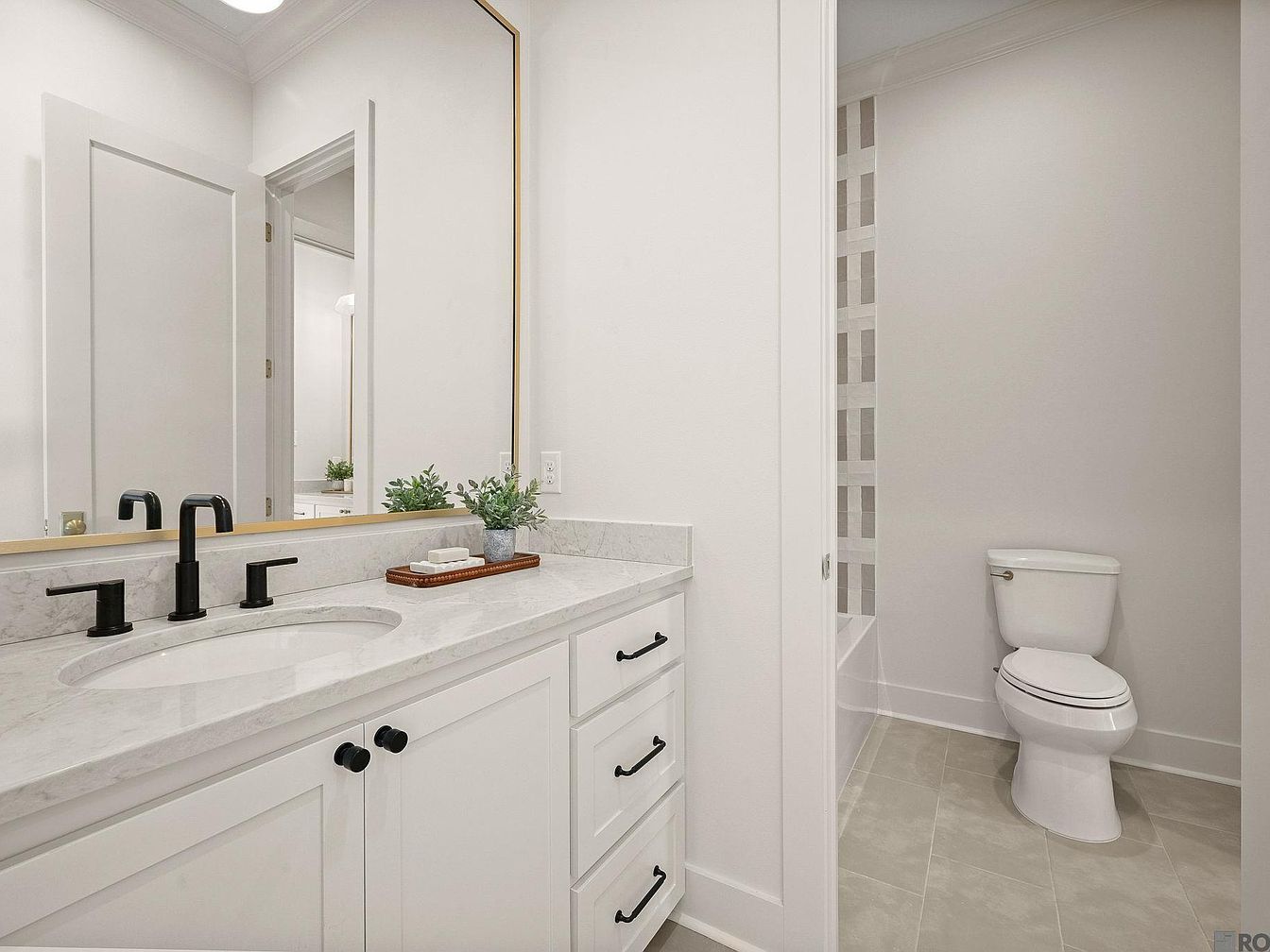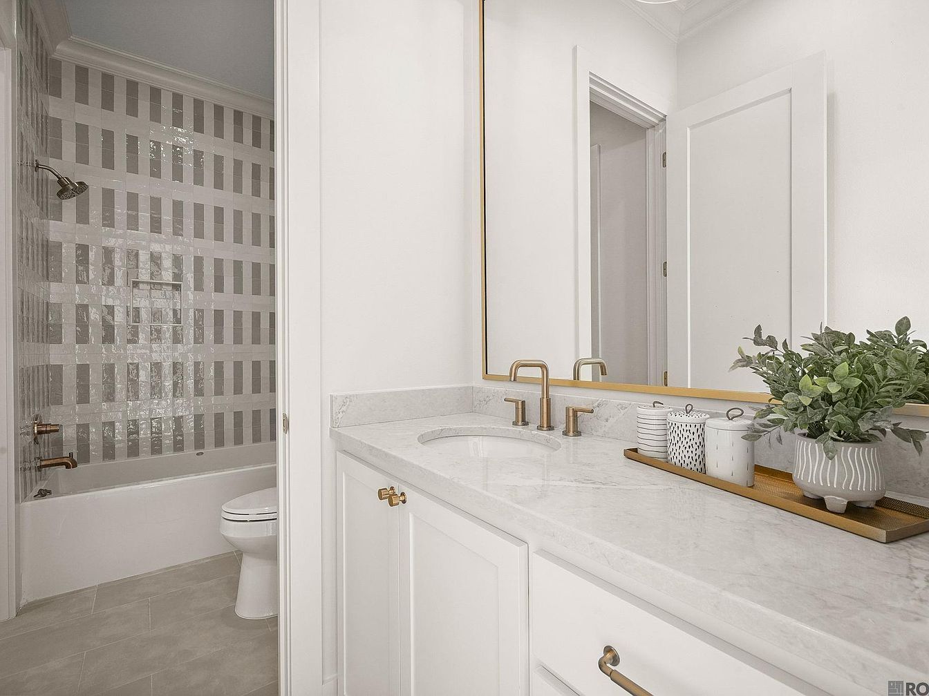 This bathroom features a clean and modern layout with a neutral color palette dominated by whites and soft grays, enhancing its bright and airy feel. The vanity area is equipped with white cabinetry adorned with black hardware, adding a sleek contrast. A large rectangular mirror with a thin gold frame stretches across the vanity, visually expanding the space. The marble countertop houses a matte black faucet, contributing to the minimalist yet elegant design. Adjacent to the vanity, a white toilet sits against a plain, light-colored wall. The floor consists of large, light beige tiles, providing subtle warmth. A glimpse of the bathtub’s tiled surround introduces a pattern of gray and white tiles, adding a gentle decorative touch to the otherwise understated bathroom.