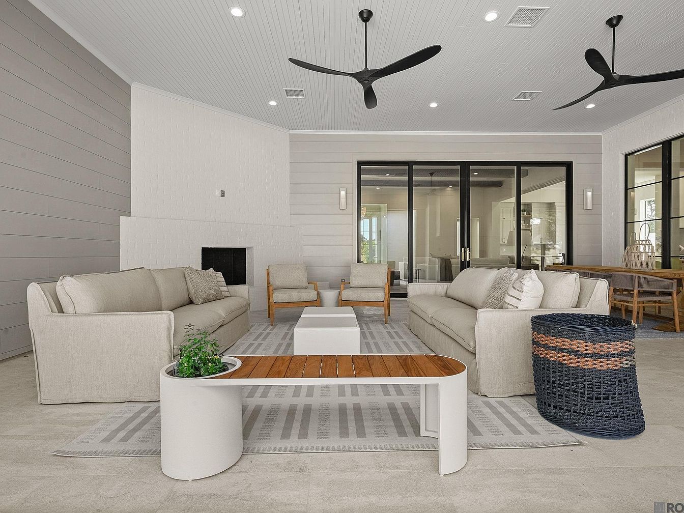 This outdoor living space features a neutral color palette with soft beige sofas flanking a pair of wooden-framed armchairs, centered around a subtle-patterned rug. A modern white bench with a wood insert and integrated plant holder adds a contemporary touch, while a woven basket-style side table introduces texture. The white brick fireplace acts as a focal point, contrasting gently with the shiplap walls in soft gray and white tones. Two sleek black ceiling fans provide functional style under the white paneled ceiling. Large glass doors connect this space seamlessly to the interior for an airy, inviting atmosphere.