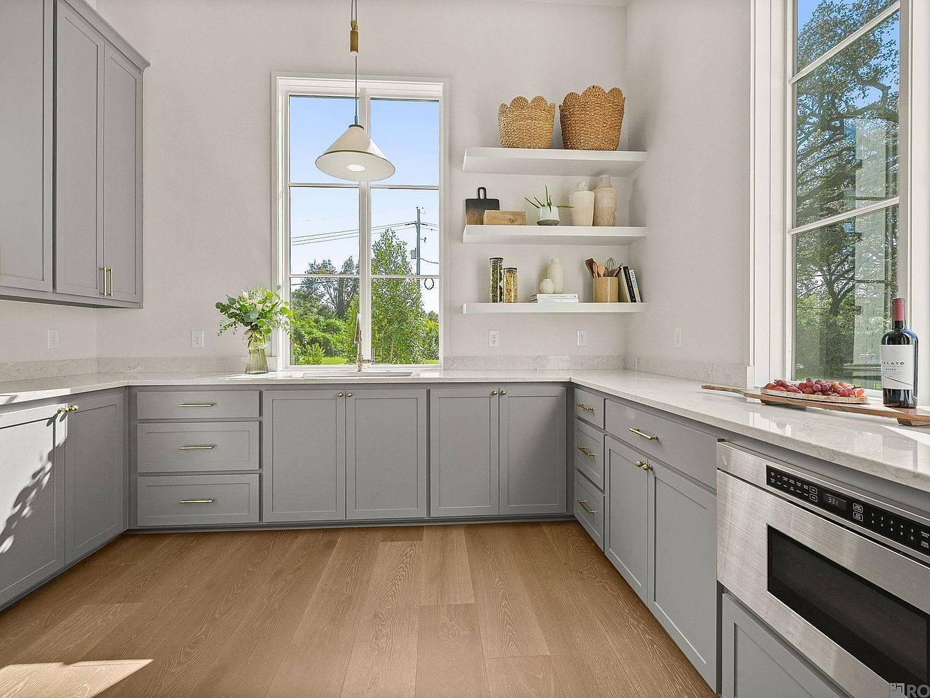 This kitchen corner features muted sage green cabinetry with sleek gold hardware, lending a modern yet soft aesthetic. Quartz countertops in light tones complement the cabinets and extend along the walls, enhancing the sense of brightness. Two large windows frame this area, flooding the space with natural light and offering serene views of green foliage outside. Open white floating shelves display woven baskets, glass jars, and minimalist ceramics, introducing texture and subtle decorative elements. A stainless steel built-in microwave and a light wood floor complete a clean, inviting, and well-organized culinary workspace.