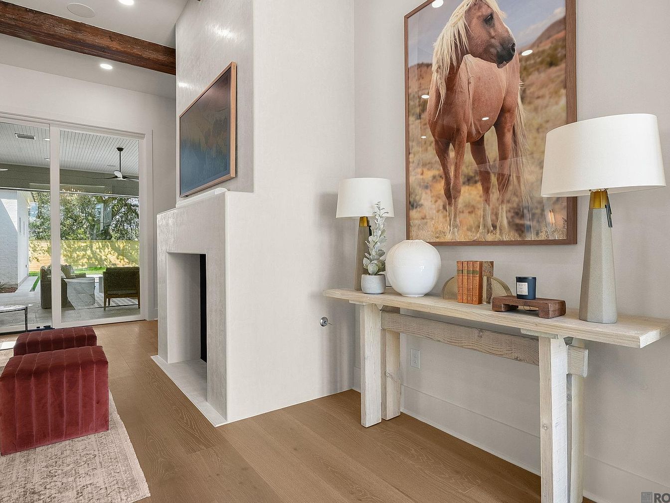 This cozy corner of the living room features a modern white fireplace with a smooth, minimalist design. A rustic wooden console table rests against the adjacent wall, adorned with neutral-toned decor including two matching lamps with tapered bases, a white ceramic vase, a few vintage books, and a dark candle holder. Above the table is a large framed photograph of a horse in an outdoor setting, adding a natural and warm touch. The floor is light oak hardwood, paired with a soft, neutral area rug and deep red velvet stools, while natural light streams through expansive glass sliding doors leading to an outdoor sitting area.