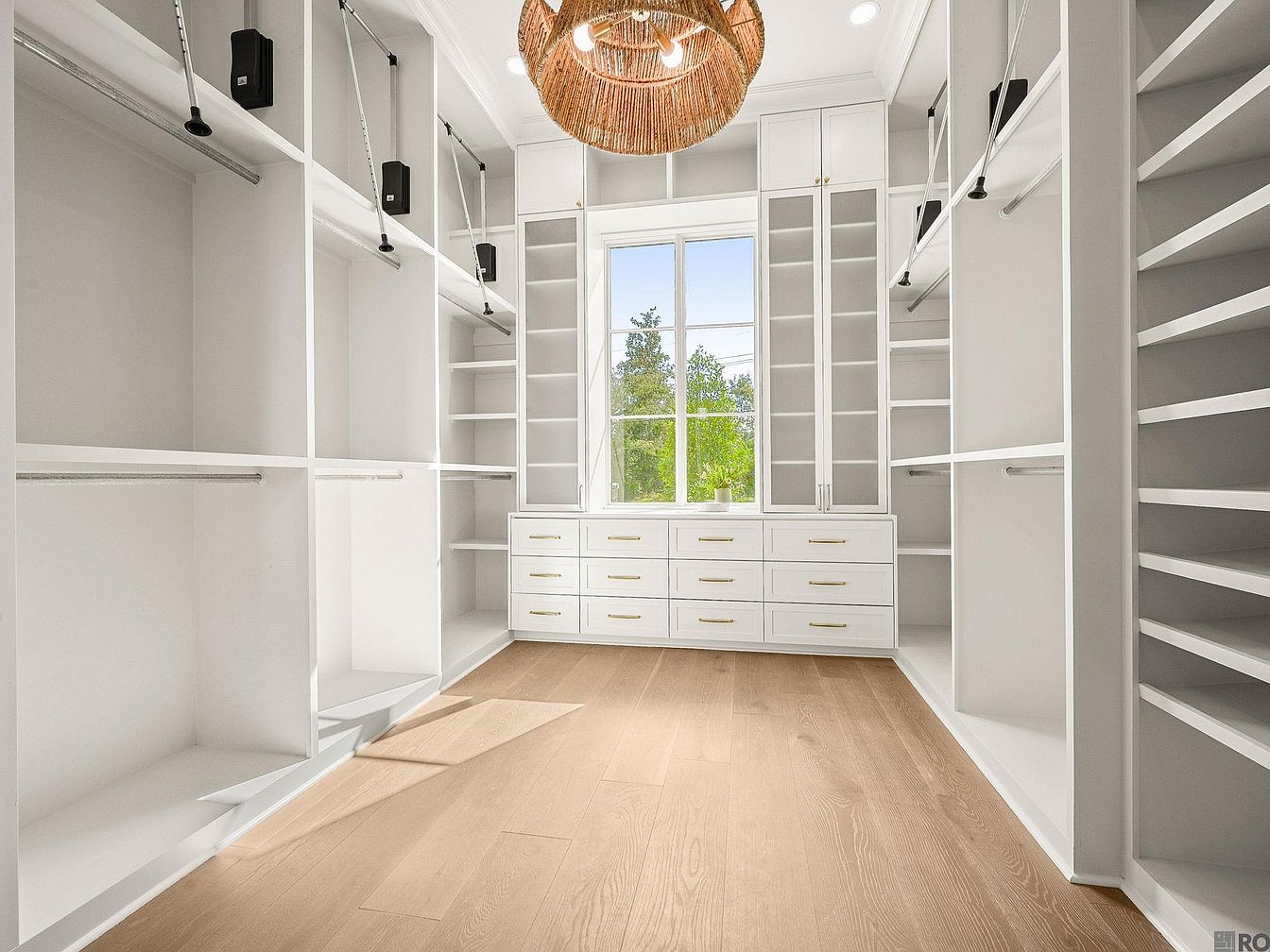 This spacious walk-in closet is designed with a modern and clean aesthetic, featuring all-white built-in shelving, drawers, and hanging rods. The layout maximizes vertical storage with tall cabinetry and multiple open sections for versatile organization. A large window at the far end brings in natural light, illuminating the light wood flooring below. The sleek white drawer handles add a touch of subtle elegance, while the woven chandelier hanging from the ceiling introduces a warm, natural texture, creating a fresh, airy feel that blends functionality with stylish sophistication.