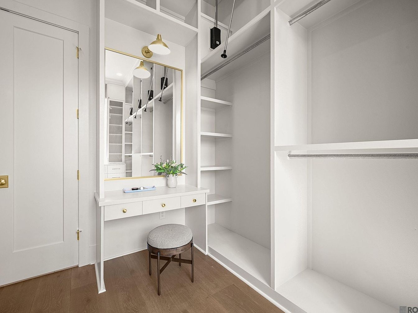 This walk-in closet features a clean, minimalist design with white built-in shelving units and hanging rods for ample storage. The space includes a small vanity table with three drawers, topped by a large rectangular mirror framed in gold, adding a subtle touch of elegance. Above the mirror, a matching gold sconce light enhances the area with warm illumination. A round cushioned stool with dark wooden legs provides seating in front of the vanity. The flooring is light wood, contrasting softly against the predominantly white walls and cabinetry, creating a bright and airy atmosphere.