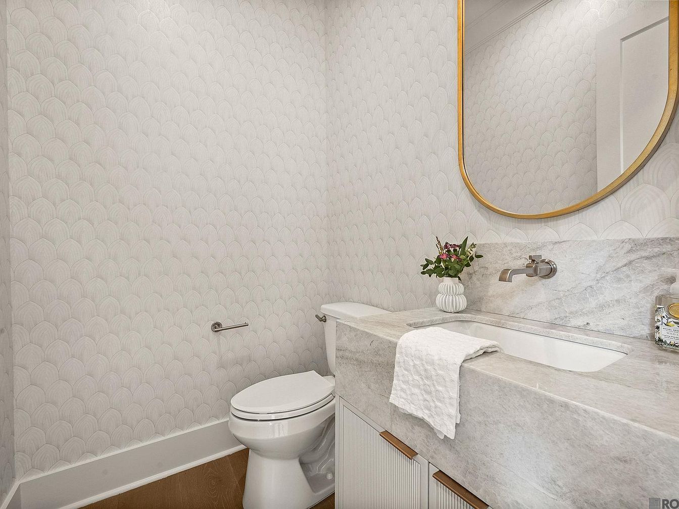 This bathroom features a serene and sophisticated design with soft white and light gray tones. The walls are adorned with subtle, scalloped-pattern wallpaper that adds texture and elegance without overwhelming the space. A floating vanity with a light gray marble countertop and integrated sink offers a clean and modern look. The brushed metal faucet and matching hardware provide a sleek, contemporary touch. Above the vanity, a large oval mirror with a thin gold frame enhances the space with warmth and style. The space is complemented by light wood flooring and tasteful decorative elements, including a small floral arrangement and a neatly folded white towel.
