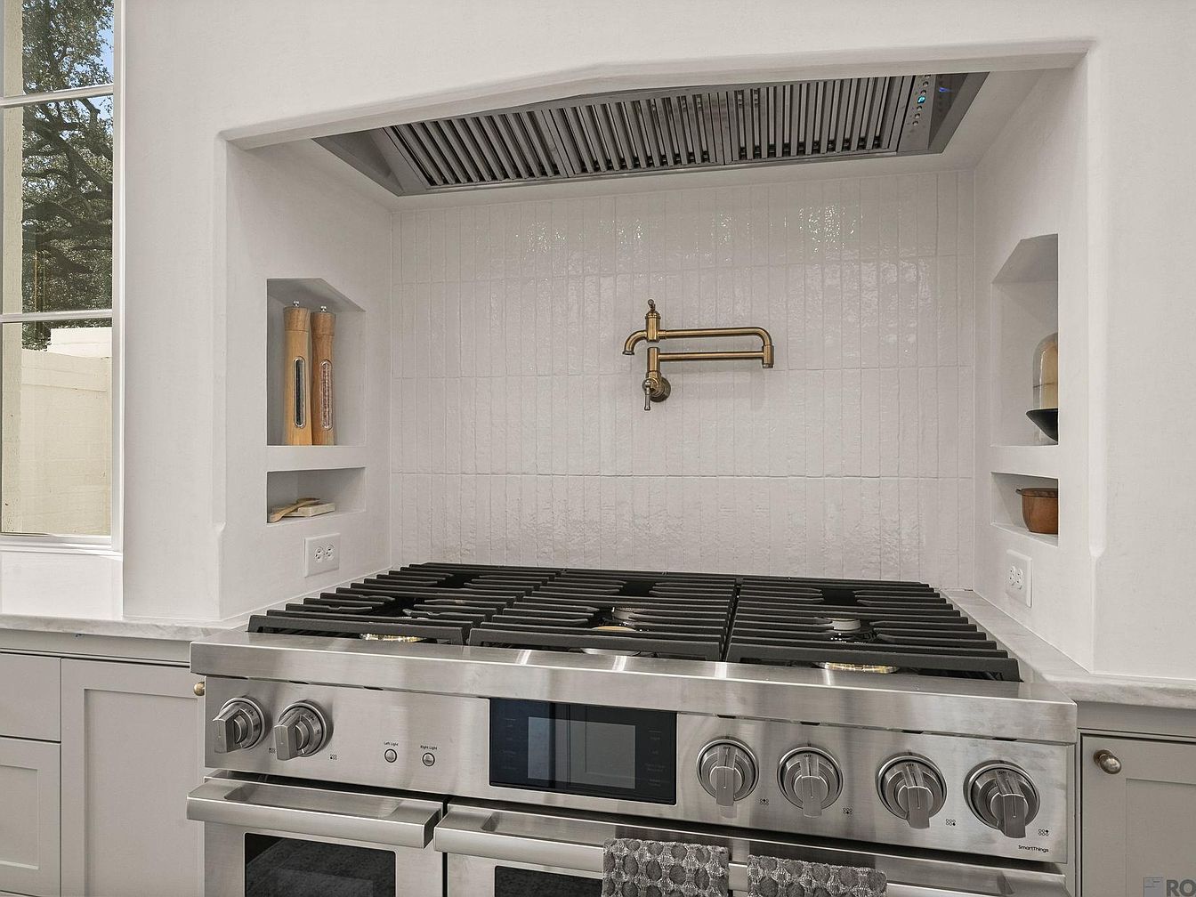 A sleek, professional-grade stainless steel gas stove with multiple burners anchors this kitchen section. Above it, a modern overhead vent hood is built into a stylish alcove, flanked by small recessed shelves that hold minimalist kitchen essentials and decorative containers. The backsplash features vertically aligned, glossy white tiles adding subtle texture, while a brass pot filler faucet mounted on the wall highlights both functionality and refined design. Soft gray cabinetry with simple hardware borders the stove, complemented by a white marble countertop. Natural light streaming from a nearby window enhances the clean, contemporary aesthetic of this cooking space.