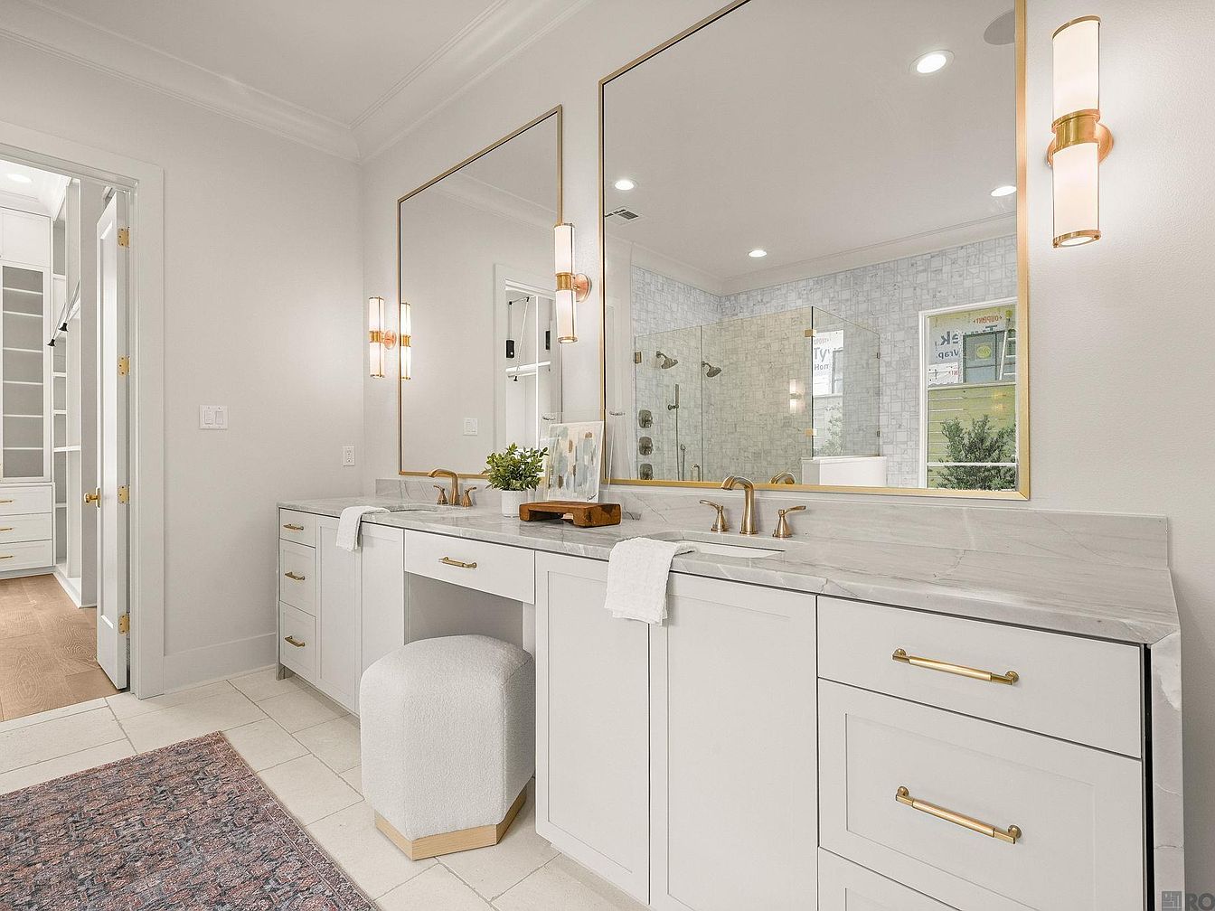 This bathroom space features a long, white vanity with a marble countertop, offering dual sinks separated by a small vanity seating area with a plush, light-colored stool. The cabinetry is crisp white with sleek brass hardware, contributing a warm metallic accent. Two large, rectangular mirrors with thin gold frames hang above each sink, flanked by elegant brass sconces with frosted shades. The floor is tiled in a light tone, complemented by a muted-pattern rug that adds warmth. Visible through an open door is a walk-in closet with white cabinetry, while a glimpse of a glass shower enclosure with tiled walls reflects a clean, contemporary aesthetic.