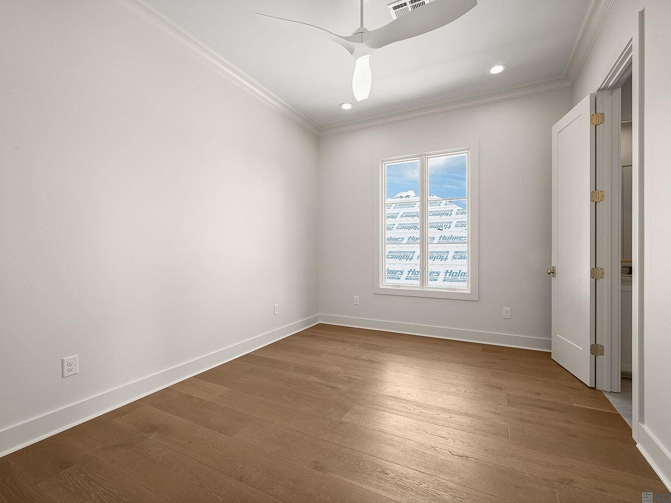 This cozy bedroom features a minimalist design with soft neutral tones creating a serene atmosphere. The walls and ceiling are painted in a light, creamy white, complemented by elegant crown molding that adds subtle architectural detail. Natural light filters gently through a double-pane window, framed simply in white trim. The floor is outfitted with wide plank wood flooring in a warm, natural oak stain, enhancing the room’s welcoming feel. A modern white ceiling fan with an integrated light fixture provides both airflow and illumination. Adjacent to the window is a doorway leading to an en suite or closet space, highlighting the functional layout.