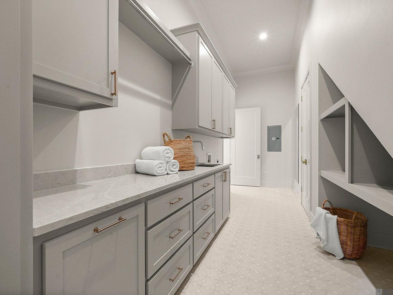 This slim, well-organized laundry space showcases a soft neutral palette with light gray cabinetry that lines one wall, featuring sleek brass hardware for a touch of warmth. A marble-like countertop offers ample surface for folding or sorting laundry, complemented by a built-in sink for convenience. Above the counter, upper cabinets provide generous storage and a hanging rod for drying clothes. The floor is tiled in a subtle geometric pattern, adding visual interest without overwhelming the serene ambiance. On the opposite wall, open shelving under a stairway recess holds a basket with textiles, blending functionality with simple, clean architectural details.