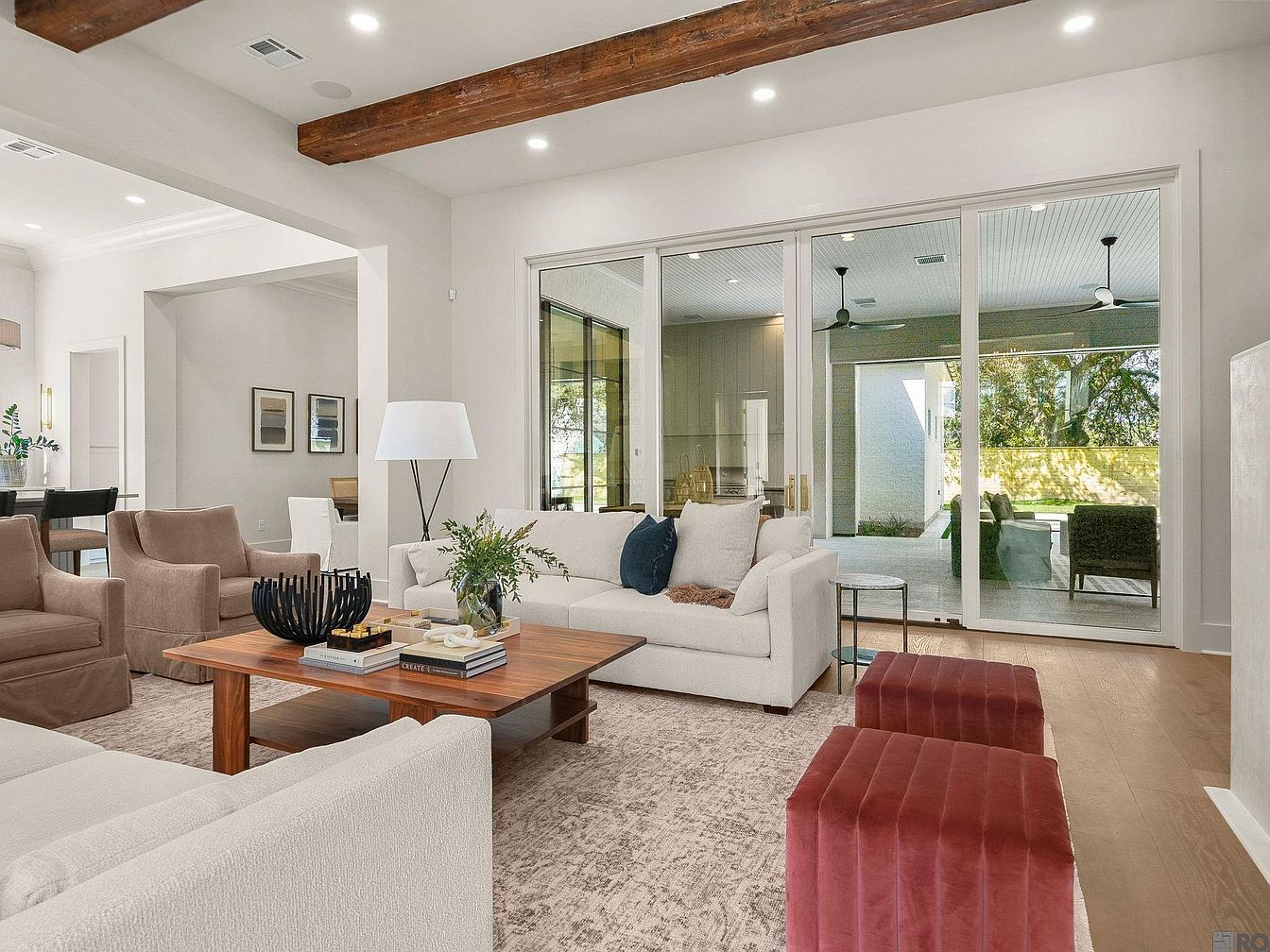 This living room showcases a serene and inviting space with a neutral color palette dominated by cream, beige, and warm wood tones. Exposed wooden beams on the ceiling add architectural interest and warmth. The seating includes soft upholstered chairs and sofas, arranged around a large, low wooden coffee table adorned with décor and plants, fostering a welcoming atmosphere. Adjacent to a large sliding glass door, the room connects seamlessly to a covered patio, expanding the living area visually and spatially. Plush velvet ottomans in deep red provide a pop of color, complementing the subtle, textured area rug on the light hardwood flooring.