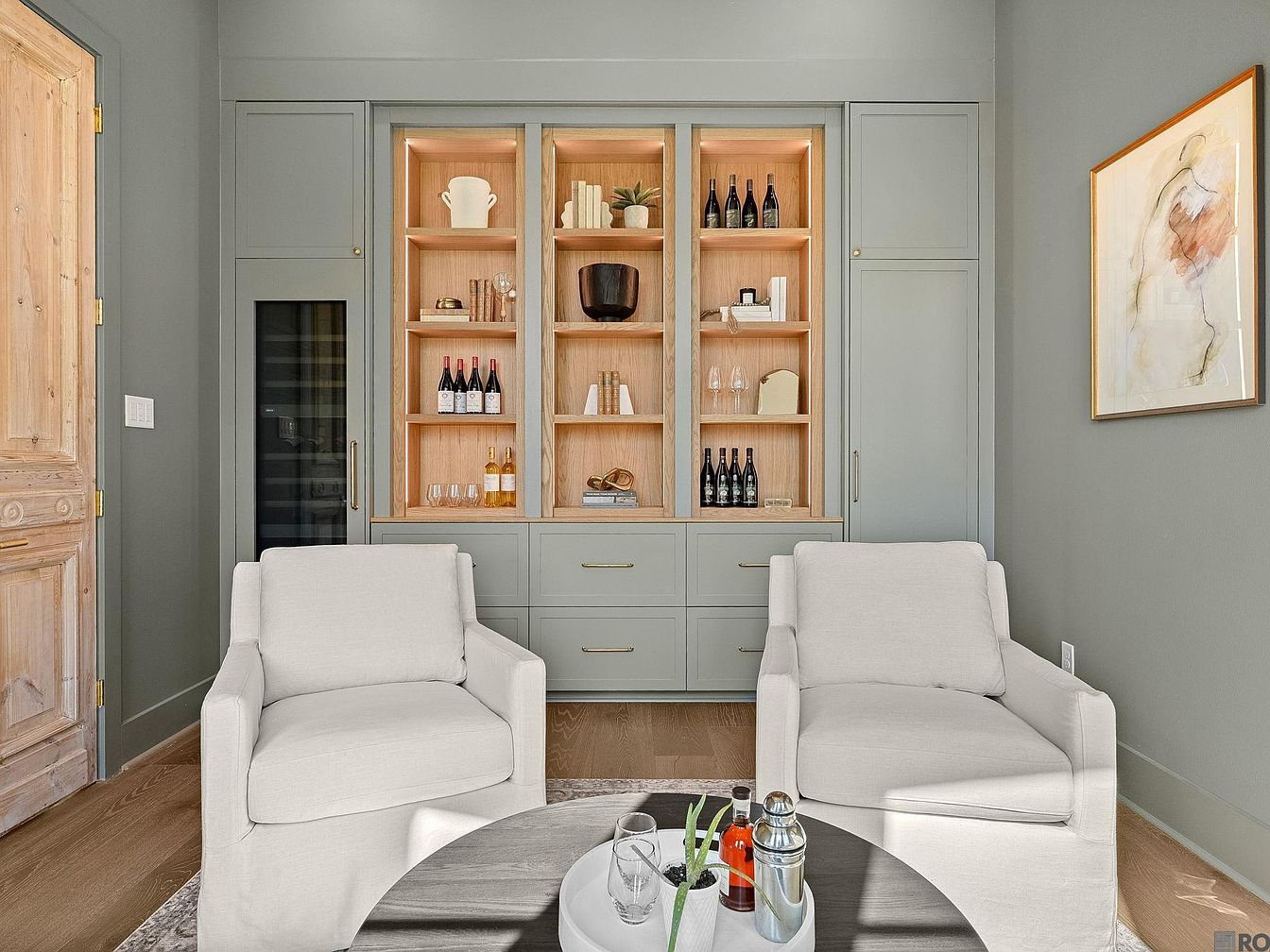 A cozy sitting area arranged with two plush, off-white armchairs facing a round coffee table that holds a tray with decorative and barware items. The backdrop features a built-in cabinetry wall unit in muted sage green with natural wood shelves highlighted by warm recessed lighting. This shelving showcases an elegant assortment of wine bottles, glassware, books, and decorative pieces. The cabinetry extends to concealed storage with brass handles, offering a blend of functionality and style. Light wood flooring and soft gray-green walls complement the overall calming and inviting palette. An abstract painting in soft tones adds artistic flair to the space.