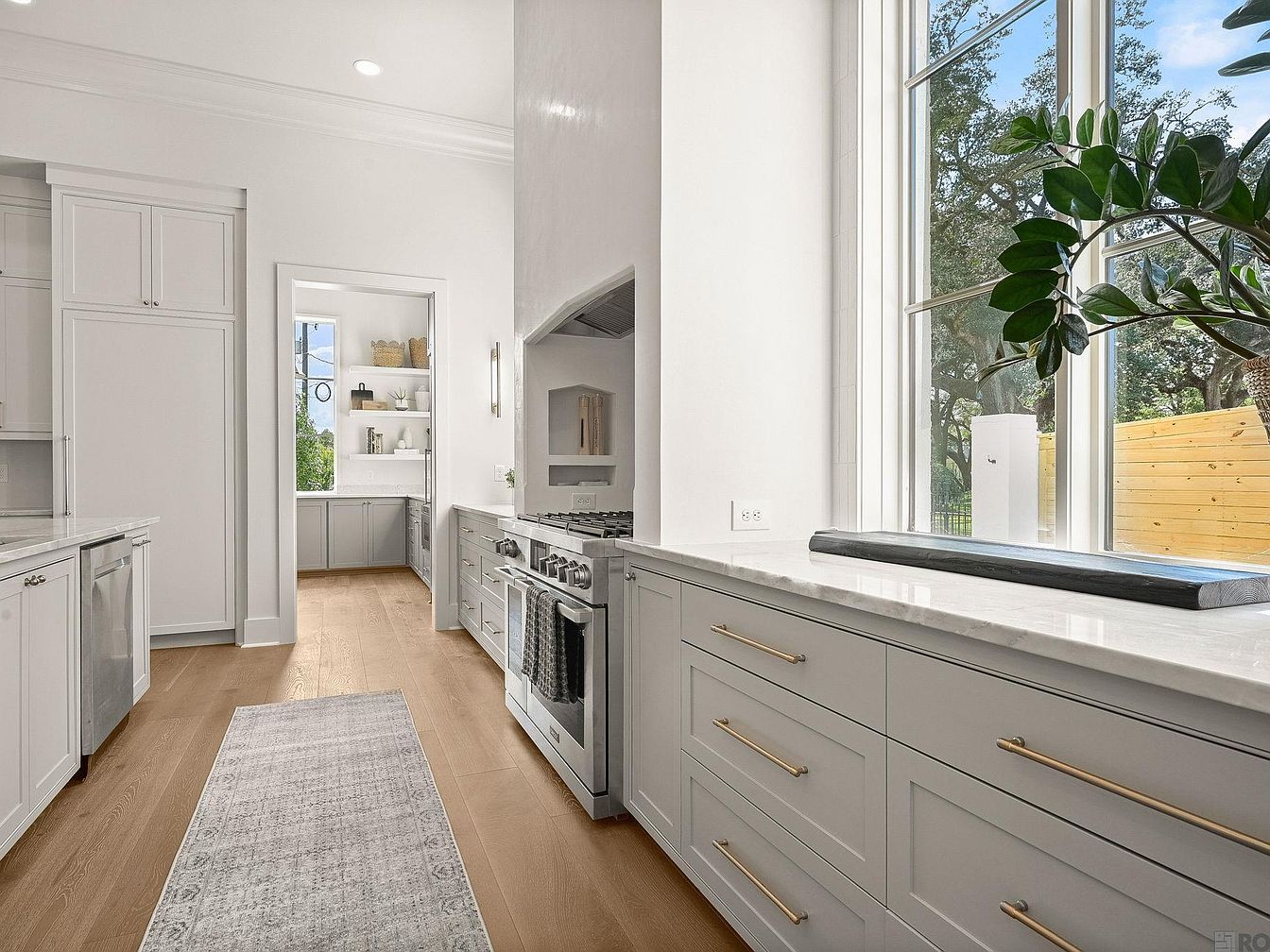 This kitchen features a narrow galley layout with light gray cabinetry accented by sleek gold hardware. A large window on the right floods the space with natural light, offering a view of a wooden fence and lush trees beyond. The countertops are a polished light marble, complementing the warm wood floor that stretches the length of the kitchen. A stainless steel gas range sits centrally under a recessed hood area. The high ceiling and white walls emphasize brightness and openness, while a soft gray runner adds warmth and texture to the floor. The adjoining pantry or secondary kitchen area can be seen through the doorway at the end, with open shelving and cabinetry continuing the clean, modern aesthetic.