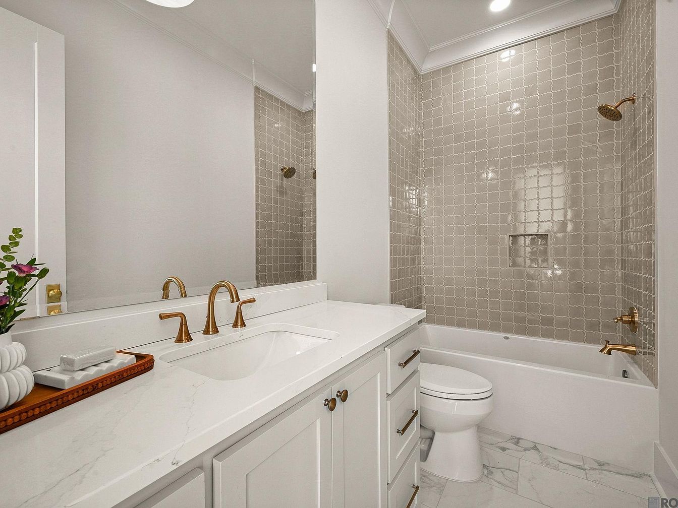 This bathroom combines modern elegance with subtle warmth, featuring a white marble countertop that complements the sleek cabinetry below. The vanity is adorned with brushed brass fixtures which create a sophisticated yet inviting contrast against the white surfaces. Above, a large, framed mirror enhances the sense of space and brightness. Adjacent to the vanity, the tub and shower showcase a visually striking tile design with vertical and horizontal stripes in muted gray and beige tones, adding a contemporary touch. The floor is tiled in large, neutral slabs that unify the room’s clean, cohesive aesthetic.