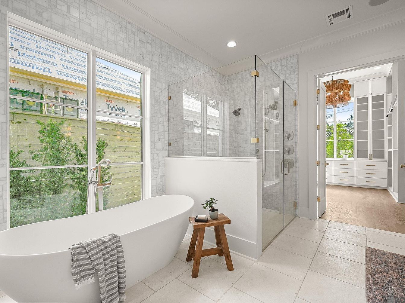 This bathroom features a modern, clean design with a freestanding oval bathtub positioned beside large windows that bring in abundant natural light. The walls are adorned with subtle patterned tiles in muted gray and white tones, creating a sophisticated backdrop. Next to the tub is a small wooden stool holding a potted plant and soap, adding warmth and a touch of nature. A frameless glass shower with brass hardware occupies the corner, complementing the room’s minimalist style. The floor is tiled in pale stone, and through the doorway, a bright walk-in closet with white cabinetry and wooden flooring is visible, enhancing the sense of luxury and openness.