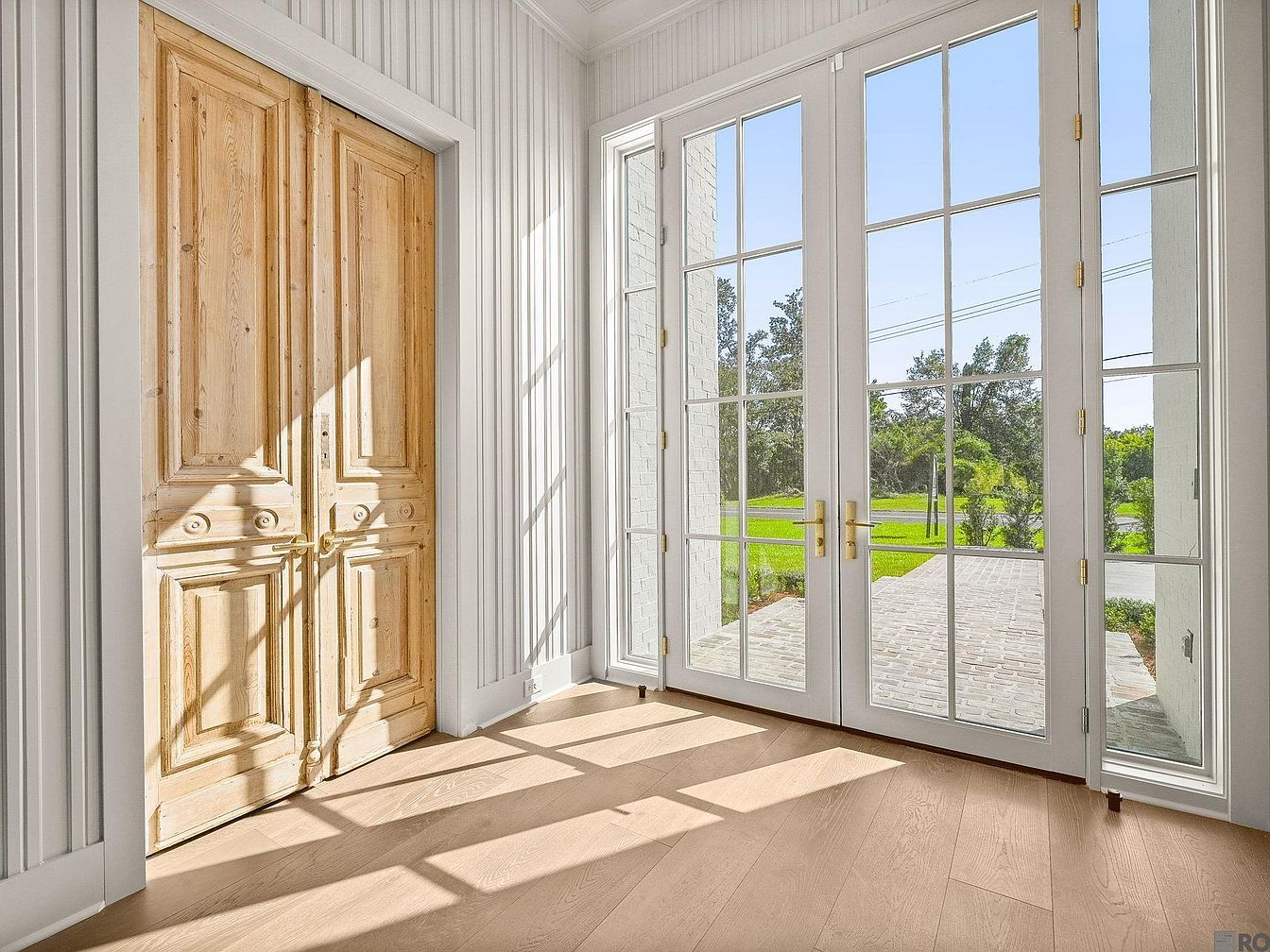 This bright, welcoming entryway features a combination of classic and modern design elements. The natural wood double doors present intricate paneling, adding a warm rustic charm. Opposite the doors, expansive glass French doors with white frames open to an outdoor space, inviting ample natural light to flood the room. The walls are covered with white beadboard paneling, complementing the light oak hardwood flooring that runs throughout. The gold hardware on the doors adds a refined touch to the neutral palette, creating a harmonious balance of textures and light, making this entry both elegant and inviting.