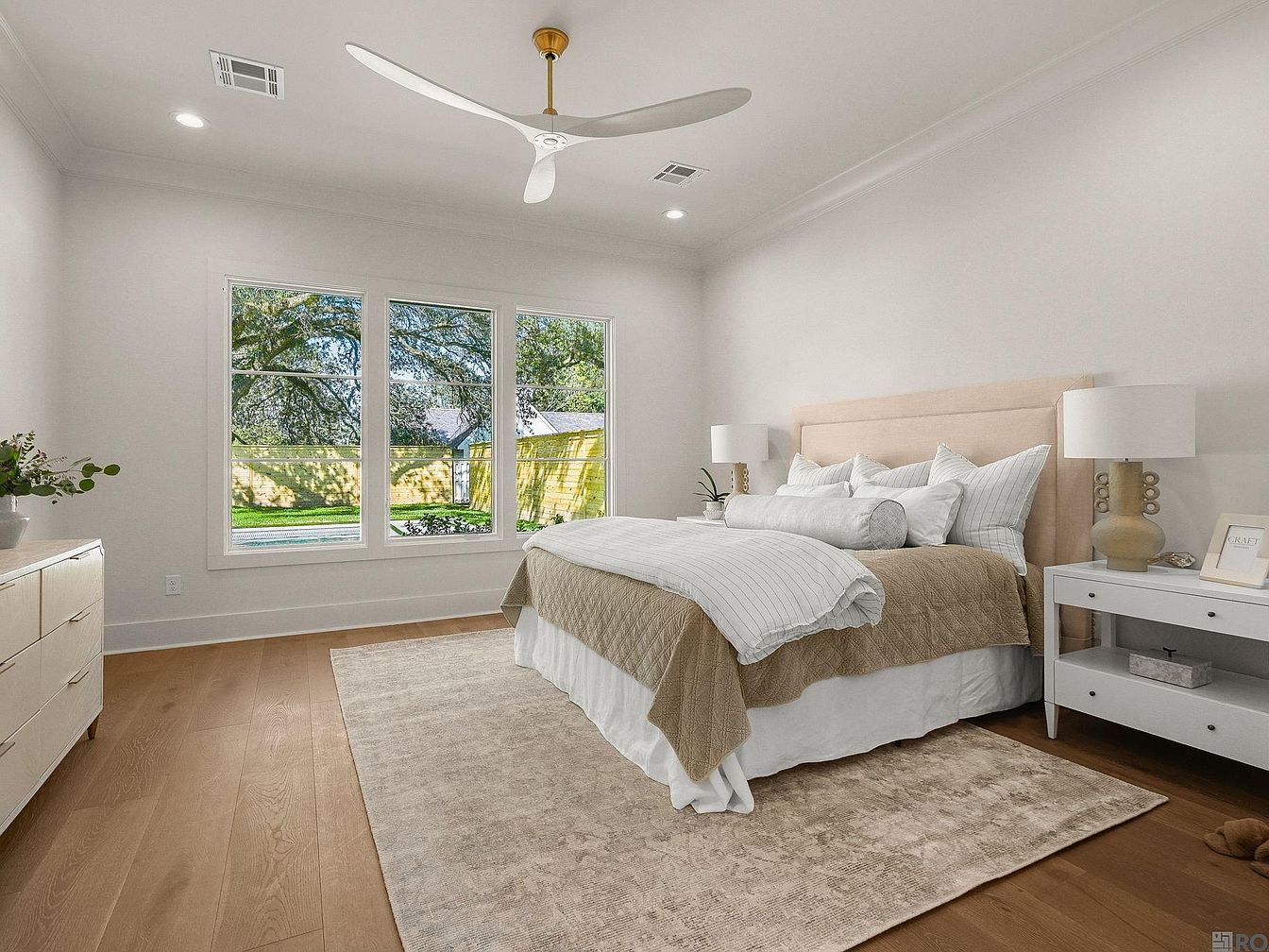 This master bedroom exudes a serene and minimalist aesthetic, featuring a soothing neutral palette of whites, beiges, and soft browns. The large windows flood the room with natural light, highlighting the wooden floors and making the space feel airy and open. A beige upholstered headboard complements the neatly arranged bed with crisp white linens and a quilted light brown coverlet. Matching bedside tables hold modern lamps with earthy ceramic bases, adding an artisanal touch. The room is anchored by a subtle patterned area rug that adds warmth and texture, while the sleek white ceiling fan above enhances the room’s contemporary, tranquil vibe.