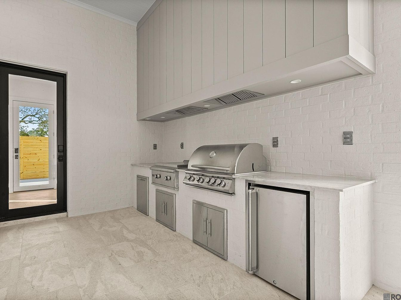 This sleek outdoor kitchen area features a built-in stainless steel grill and cooktop set into a white brick countertop and base. The surrounding walls are painted white with a textured brick finish, enhancing the clean and modern aesthetic. Overhead, a large light grey paneled hood with built-in lighting and ventilation provides both style and functionality. Floor tiles in a neutral stone tone extend through the space, complementing the white and grey palette. A glass door framed in black leads outside, allowing natural light to flood the space while maintaining a seamless indoor-outdoor transition.