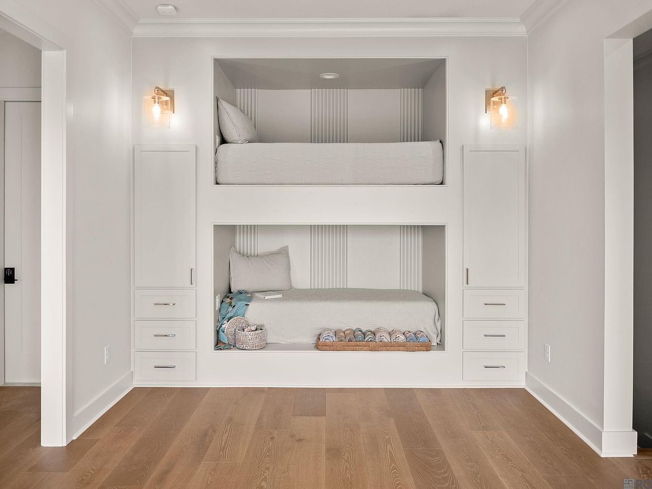 This bedroom corner features a custom built-in bunk bed setup neatly recessed into the wall, maximizing space efficiency. The dual beds are stacked vertically within a white frame, each with subtle vertical panel details on the back wall that add texture without overwhelming the calm, neutral palette. Adjacent to each bed are sleek built-in cabinetry units with drawers and handles for essential storage, maintaining a clean and organized look. Warm wood flooring enhances the inviting atmosphere, and two modern glass wall sconces with exposed bulbs on either side of the beds add gentle ambient lighting, blending modern and minimalist aesthetics perfectly.