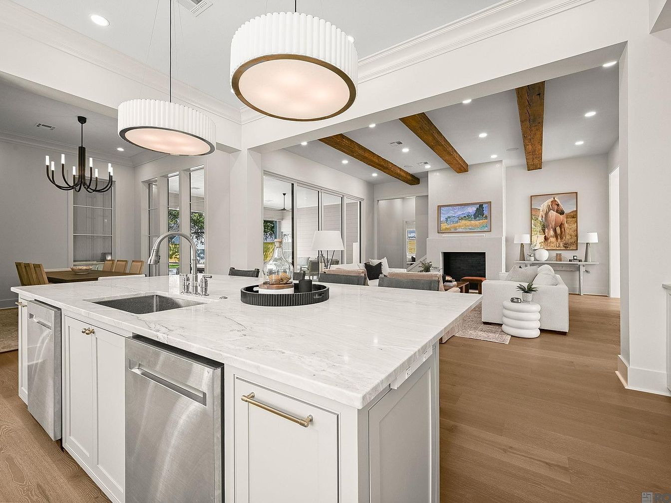This space features a seamless open concept tying the kitchen, dining, and living areas together. The kitchen island boasts a polished white marble countertop outfitted with a modern stainless steel sink and dishwasher, complemented by soft white cabinetry with subtle brass hardware. Above, two large, round pendant lights add a cozy, elegant touch, while recessed lighting brightens the entire area. Warm wood flooring extends throughout, balancing the crisp white walls and cabinetry. Exposed wooden ceiling beams in the living space add rustic charm. A fireplace anchors the living room, flanked by tasteful artwork and neutral-toned furniture evoking a calm, contemporary aesthetic.