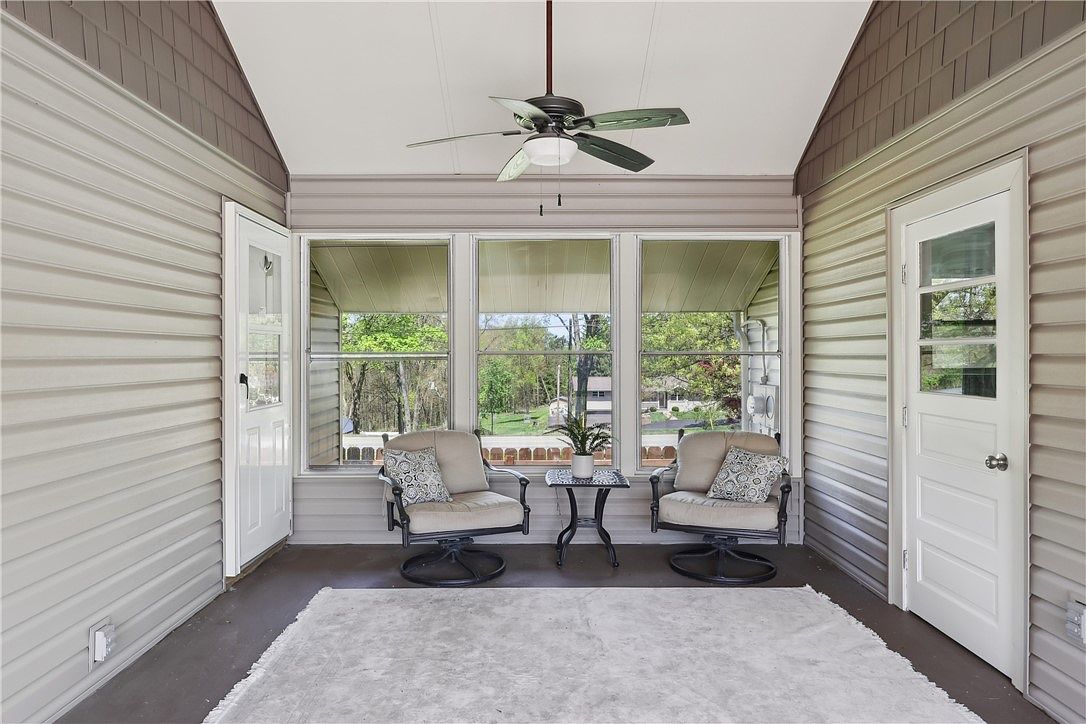 This cozy screened porch features a symmetrical layout with two cushioned swivel chairs flanking a small, decorative metal table with a potted plant on top. The walls and ceiling are clad in matching taupe-gray vinyl siding, creating a unified and weather-resistant enclosure. Three large windows fill the space with natural light and offer serene views of lush greenery outside. Two white paneled doors with windows on either side provide access points and enhance the airy feeling. A ceiling fan with dark blades hangs from the vaulted ceiling, ensuring comfort on warm days. The floor is dark with a large, light-colored rug adding softness underfoot.