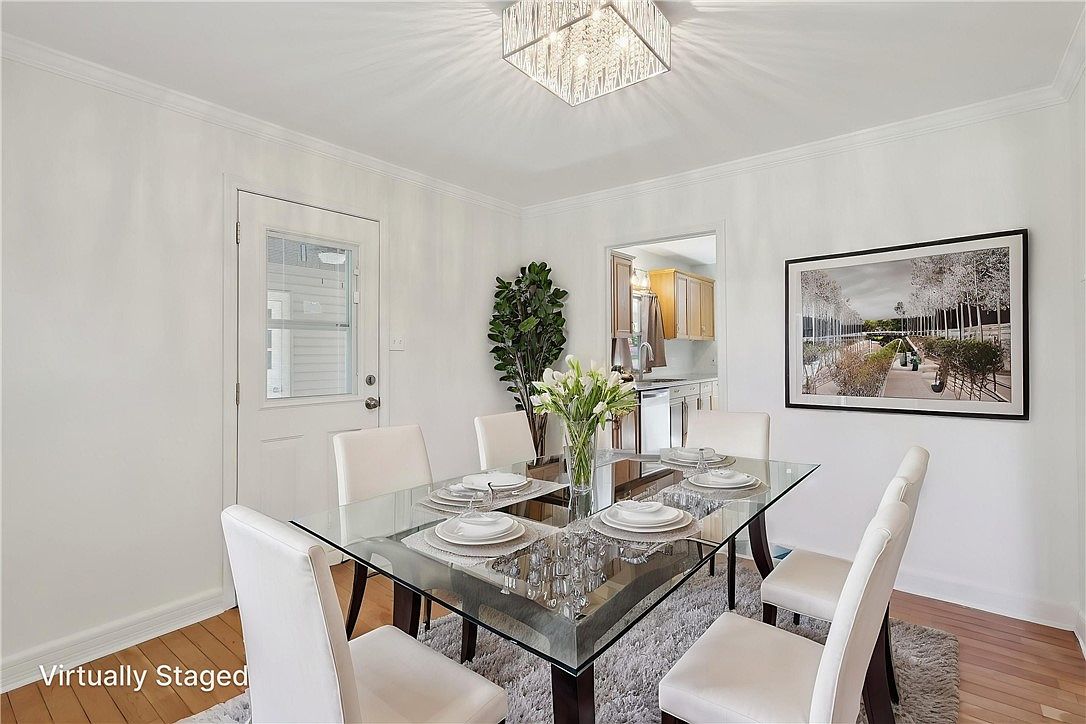 This elegant dining space features a clean, modern aesthetic with white walls and crown molding that add subtle architectural detail. The focal point is a sleek glass-top dining table with dark wooden legs, surrounded by six white upholstered chairs, creating a crisp contrast. A plush light gray area rug beneath the table adds comfort and texture. Soft natural light filters through a glass-paneled door, hinting at an adjacent outdoor area. A large black-framed artwork hangs on one wall, and a tall green plant adds a touch of nature, while a sparkling geometric chandelier overhead enhances the room’s refined, contemporary feel.
