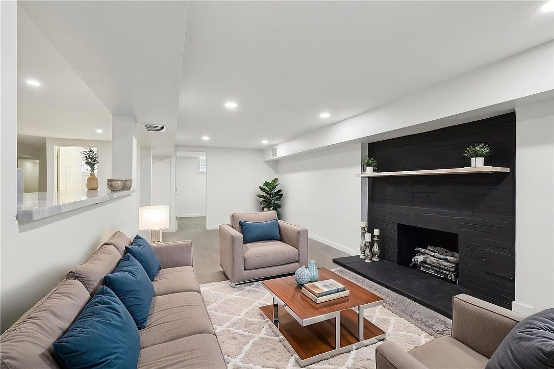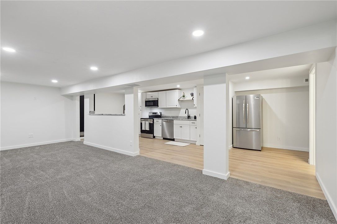 This open basement space combines a cozy living area with a sleek kitchen, characterized by a clean and modern aesthetic. The living area is carpeted in a neutral gray tone that adds warmth and comfort, contrasting with the light wood flooring in the kitchen. The kitchen features white cabinetry with black hardware, providing a fresh and bright atmosphere. Stainless steel appliances, including a refrigerator, dishwasher, and microwave, offer a contemporary touch. The countertops are a gray and white marble-like surface, complemented by a black faucet and open shelving for added functionality and style. Recessed ceiling lights throughout the space ensure bright and even illumination.