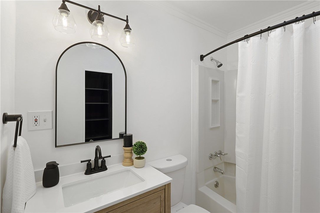 This bathroom area features a clean, modern design with a neutral color palette dominated by white walls and fixtures. A rectangular white vanity countertop with a built-in sink is paired with a wooden cabinet below, adding warmth. Above the sink is a large, black-framed arched mirror, reflecting light and creating a focal point. The black hardware, including the faucet and towel holder, adds contrast and a contemporary touch. Lighting consists of three glass globe bulbs mounted on a rustic bronze fixture. To the right, a white shower curtain conceals a classic bathtub with built-in shelves and silver fixtures, maintaining the room’s minimalist elegance and functionality.
