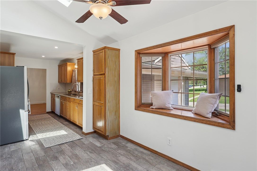This space combines a practical kitchen with a cozy breakfast nook. The kitchen features wooden cabinetry with a warm honey finish, complemented by a granite countertop and stainless steel appliances, including a large refrigerator and dishwasher. A long, neutral runner rug softens the wood-look tile flooring, which extends through the area. The white walls enhance the natural light streaming through the bay window nook, framed in matching wood trim. Two plush cushions invite relaxation or casual seating, making this a bright, functional area ideal for both cooking and casual dining.