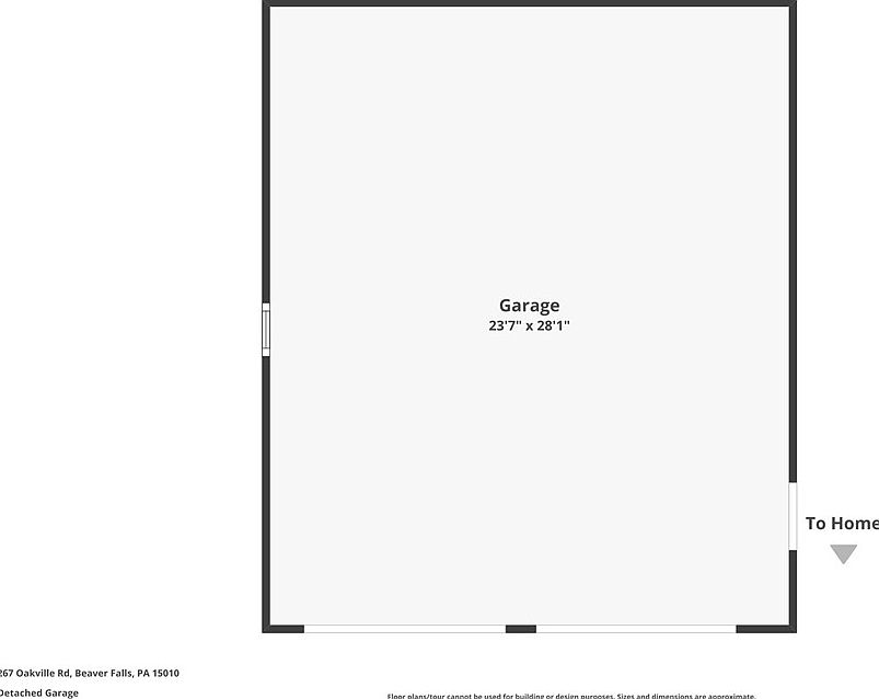This generously sized detached garage measures 23 feet 7 inches by 28 feet 1 inch, offering ample space for multiple vehicles or storage needs. The simple, clean layout includes a large main door entry on one side, providing easy access for cars, and a smaller side door for pedestrian entry. The design prioritizes functionality with a rectangular open floor plan, making it versatile for various uses beyond parking, such as a workshop or hobby area. The straightforward configuration complements the home’s practical aesthetic and enhances convenience with direct access to the house.