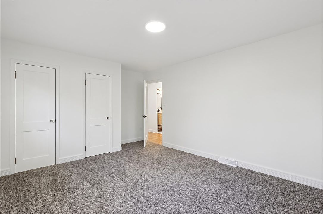 This bedroom features a clean, minimalist design with soft, neutral tones enhancing a calm atmosphere. Grey carpeting covers the floor, adding warmth and texture against the stark white walls and ceiling. Twin white doors on one wall likely conceal closets, offering practical storage without interrupting the room’s openness. A third door, partially open, leads to an adjoining area with warm-toned hardwood flooring, suggesting easy flow between rooms. Simple white baseboards and a round ceiling light add subtle architectural details. The overall aesthetic is modern, fresh, and ready to personalize.