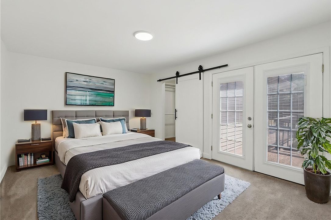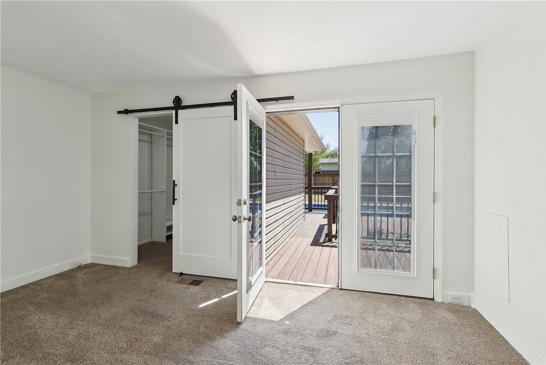 This spacious room features a neutral, soft beige carpet contrasting with crisp white walls and trim, creating a clean and airy atmosphere. A sliding barn-style door leads into a walk-in closet, adding a touch of farmhouse charm while maintaining functionality. Double French doors open outward to a wooden deck area, allowing natural light to flood in and providing easy outdoor access. The deck is visible through the clear glass panes, extending the living space visually. The overall design is simple yet inviting, blending practical elements with a subtle contemporary aesthetic.