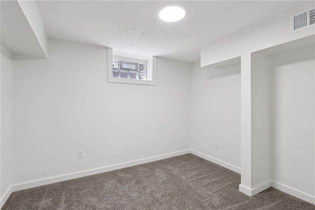This cozy basement space features soft gray carpeting that adds warmth against the crisp white walls, creating a clean and modern environment. A small, high-set window with glass blocks allows natural light to filter in while maintaining privacy. The ceiling light provides a bright, even illumination throughout the room. Architectural details include a recessed nook and ductwork concealed behind soffits, which add subtle depth and dimension to the otherwise simple layout. Two electrical outlets are present, making this room functional for various purposes such as a home office, guest room, or storage area.