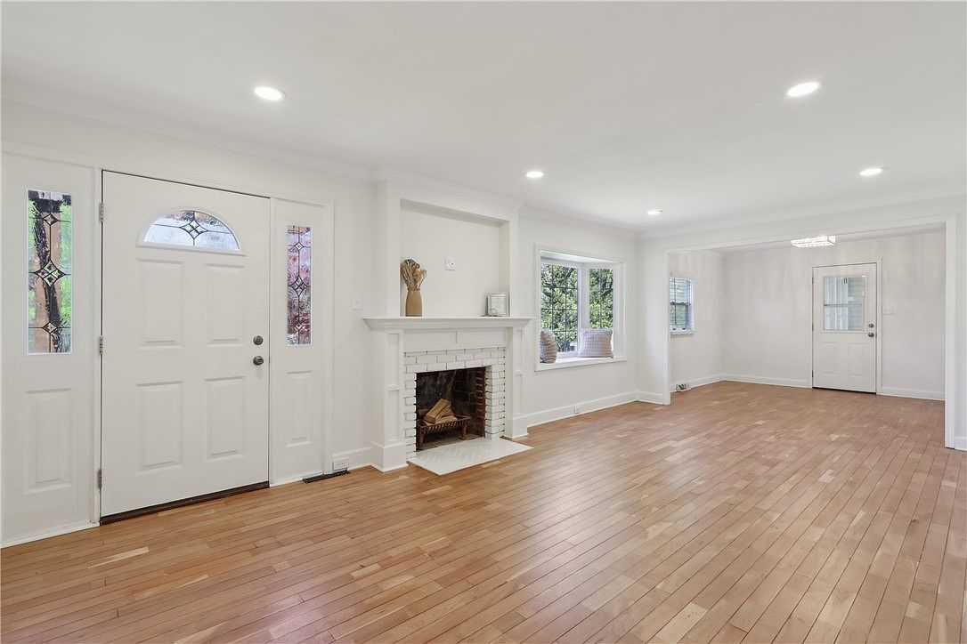 This spacious living area features a clean, bright design with soft white walls and ample recessed lighting that enhances the natural light streaming through multiple windows. The warm honey-toned hardwood floors create a welcoming contrast against the white trim and ceiling. A classic white brick fireplace with a decorative mantel serves as a charming focal point, flanked by a cozy window nook with cushions. The inviting front door includes decorative glass panels, providing visual interest and elegance. The layout opens into an adjoining room, suggesting flexibility and flow within the home’s communal spaces.