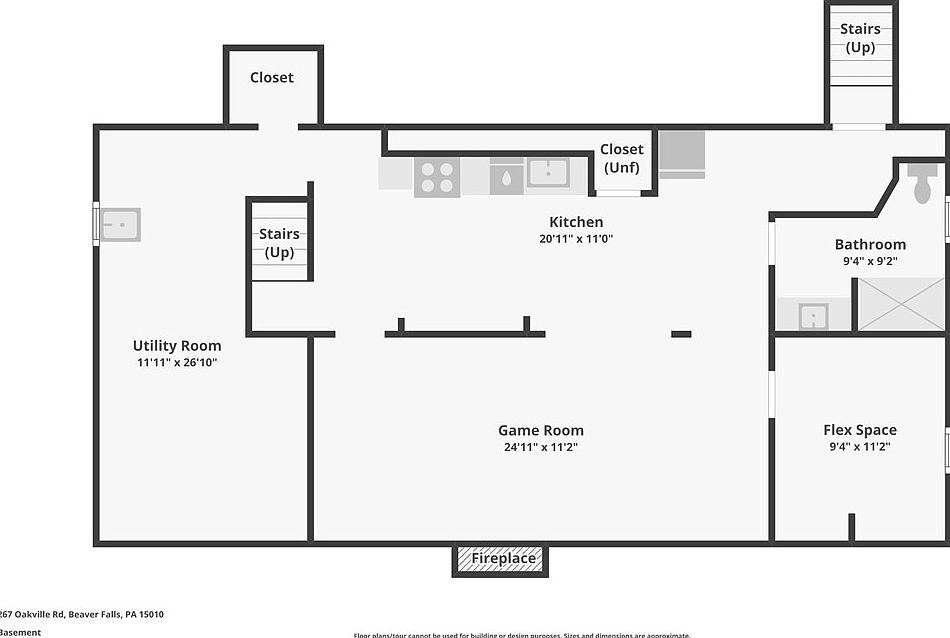 This basement layout features a spacious Game Room centrally located, measuring nearly 25 by 11 feet, ideal for entertainment or recreational activities, accentuated by a fireplace along one wall. The Kitchen area, adjacent to the game space, has ample counter space and includes a closet, suggesting storage or pantry possibilities. On one side, a large Utility Room spans nearly 12 by 27 feet, offering extensive functional space. Connected to the right side are a full Bathroom and a versatile Flex Space that can serve diverse needs, giving the basement a balanced, multi-purpose design.